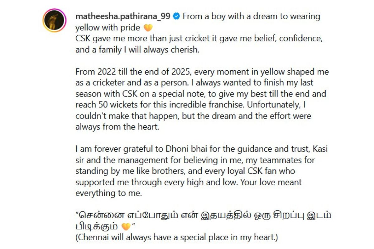 पथिराना ने अपने संदेश में एमएस धोनी का खास तौर पर धन्यवाद किया. उन्होंने कहा कि धोनी भाई का भरोसा और मार्गदर्शन उनके लिए सबसे बड़ी ताकत रहा. इसके अलावा टीम मैनेजमेंट, कोचिंग स्टाफ और साथियों को भी उन्होंने अपना परिवार बताया. पथिराना ने साफ कहा कि वह सीएसके के लिए 50 विकेट पूरे करना चाहते थे, लेकिन यह सपना अधूरा रह गया. इसके बावजूद चेन्नई उनके दिल के बहुत करीब रहेगा. उन्होंने कहा कि चेन्नई हमेशा उनका घर रहेगा और पीला रंग उनके दिल में हमेशा खास जगह रखेगा. अब वह सम्मान और गर्व के साथ केकेआर के साथ नए अध्याय की शुरुआत कर रहे हैं.