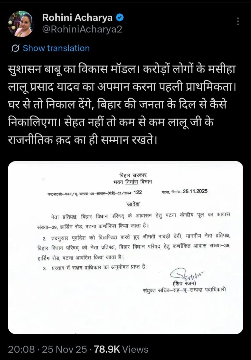 आवास खाली करने के नोटिस के बाद लालू परिवार एकजुट नजर आया था. तेजप्रताप यादव ने सोशल मीडिया पर पोस्ट कर सरकार के फैसले पर सवाल उठाए थे. वहीं रोहिणी आचार्य के तरफ से भी तीखी प्रतिक्रिया आई थी. उन्होंने लिखा था- सुशासन बाबू का विकास मॉडल. करोड़ों लोगों के मसीहा लालू प्रसाद यादव का अपमान करना पहली प्राथमिकता. घर से तो निकाल देंगे, बिहार के जनता के दिल से कैसे निकालिएगा.