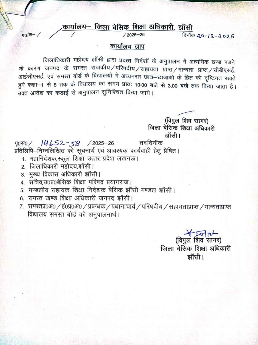 झांसी में बढ़ती सर्दी को देखते हुए जिलाधिकारी मृदुल चौधरी ने स्कूलों के समय में बदलाव के आदेश दिए हैं. कक्षा 1 से 8 तक के सभी छात्रों के लिए स्कूल अब सुबह 10 बजे से दोपहर 3 बजे तक संचालित होंगे.