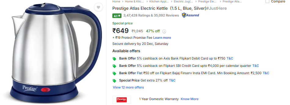 फ्लिपकार्ट पर V-Guard के 1.5 लीटर कैपेसिटी वाले इलेक्ट्रिक केटल पर 46% तक की छूट मिल रही है, जिससे इस केटल को आप 699 रुपये में खरीद सकते हैं. 1350W पावर कंजम्पशन वाले इस केटल में आपको ऑटो कट-ऑफ और पावर इंडिकेटर जैसे फीचर्स मिलेंगे. इस प्रोडक्ट पर भी 1 साल की वारंटी मिलेगी.